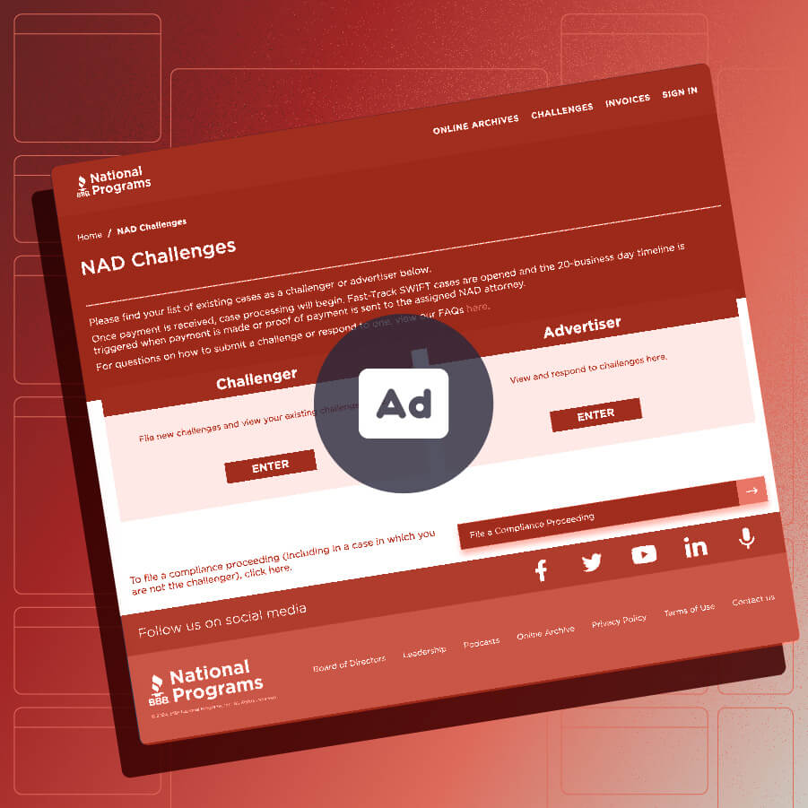 File, respond to, or manage a challenge, compliance proceeding, or appeal with the National Advertising Division (NAD) or National Advertising Review Board (NARB).